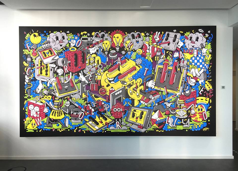 DXTR is an artist and illustrator based in Berlin. He started graffiti writing at 16 and has been developing his style ever since. His passion is sketching letters and characters. DXTR has a bold and vibrant style with a touch of cubism. He uses surfaces like walls and canvases to present his artworks. By creating crazy characters, DXTR’s work is wild yet wickedly clean. Since September 2011 he has been part of the art collective THE WEIRD together with his friends, a group of 10 urban artists spread throughout Europe, who focus on large-scale murals.