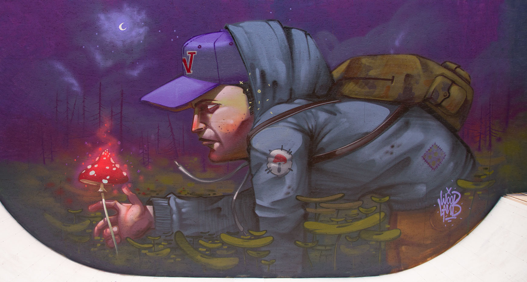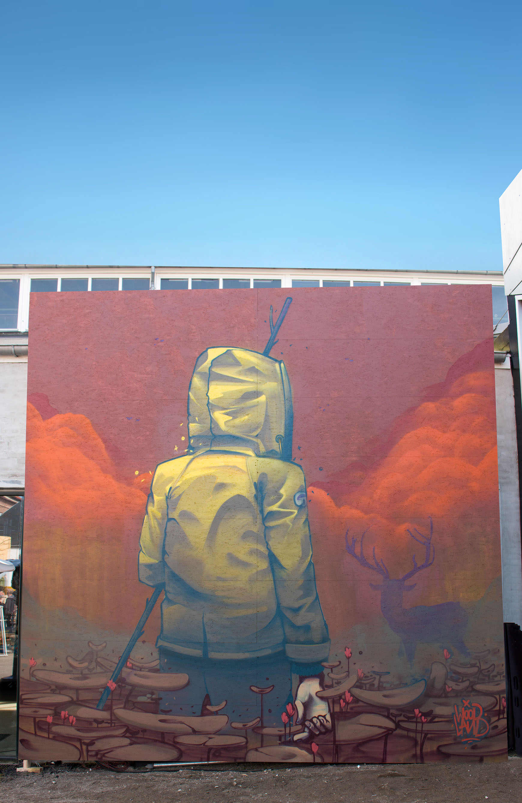 Mr. Woodland grew up and still lives in Erding, a small town close to Munich. He sprayed his first graffiti in 1993 at the age of 12. He only works with characters and describes his style as a combination of illustration, surrealism and graphic elements with a focus on high and large walls.