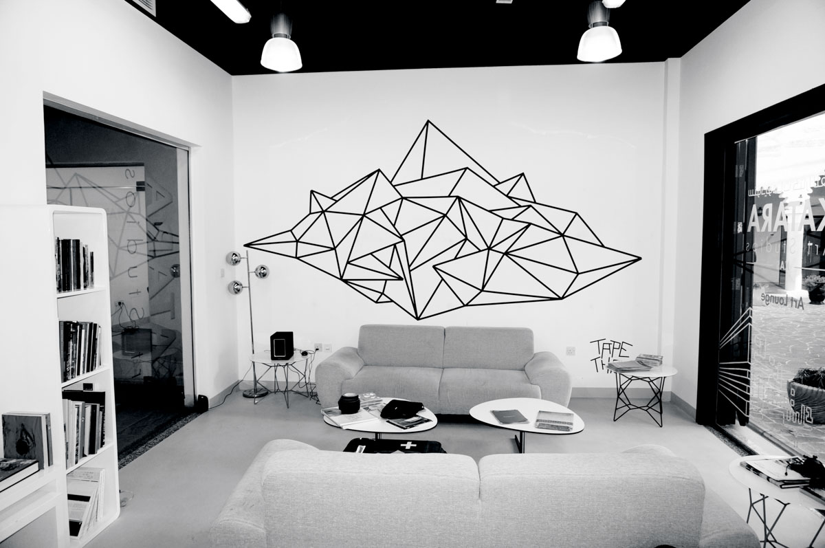 The works are essentially created out of adhesive tape which every member discovered independently from each other in their creative processes. Inspired by the possibility of creating something new out of an everyday object, they use tape to create complex and intricate structures or colorful tape and light installations as well as minimalistic black and white murals and room-installations.