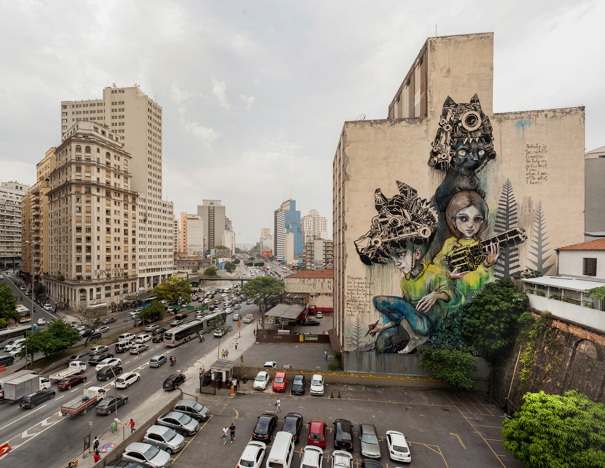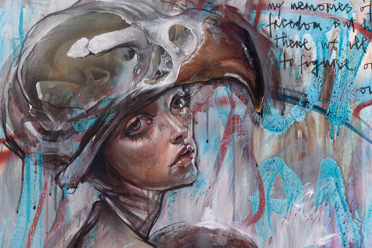 The artist duo HERAKUT was founded in 2004 when Jasmin Siddiqui (aka "Hera" of Frankfurt am Main) and Falk Lehmann (aka "Akut" of Schmalkalden) merged their names, as well as their styles. Ever since then, they have been traveling the world telling stories with spray cans, brushes and rollers in large-scale murals, gallery shows and charity projects. This particular installation inside THE HAUS was inspired by all the hate-speech and fear-mongering of those dangerously ignorant nationalists in Europe and the US. We feel like our playground, our safe-place, has been invaded, and we need to start acting before our imagination sees nothing but darkness. Therefore, we chose a title that is a motto we strongly believe in: "We need to teach our children love, or someone else will teach them hate."