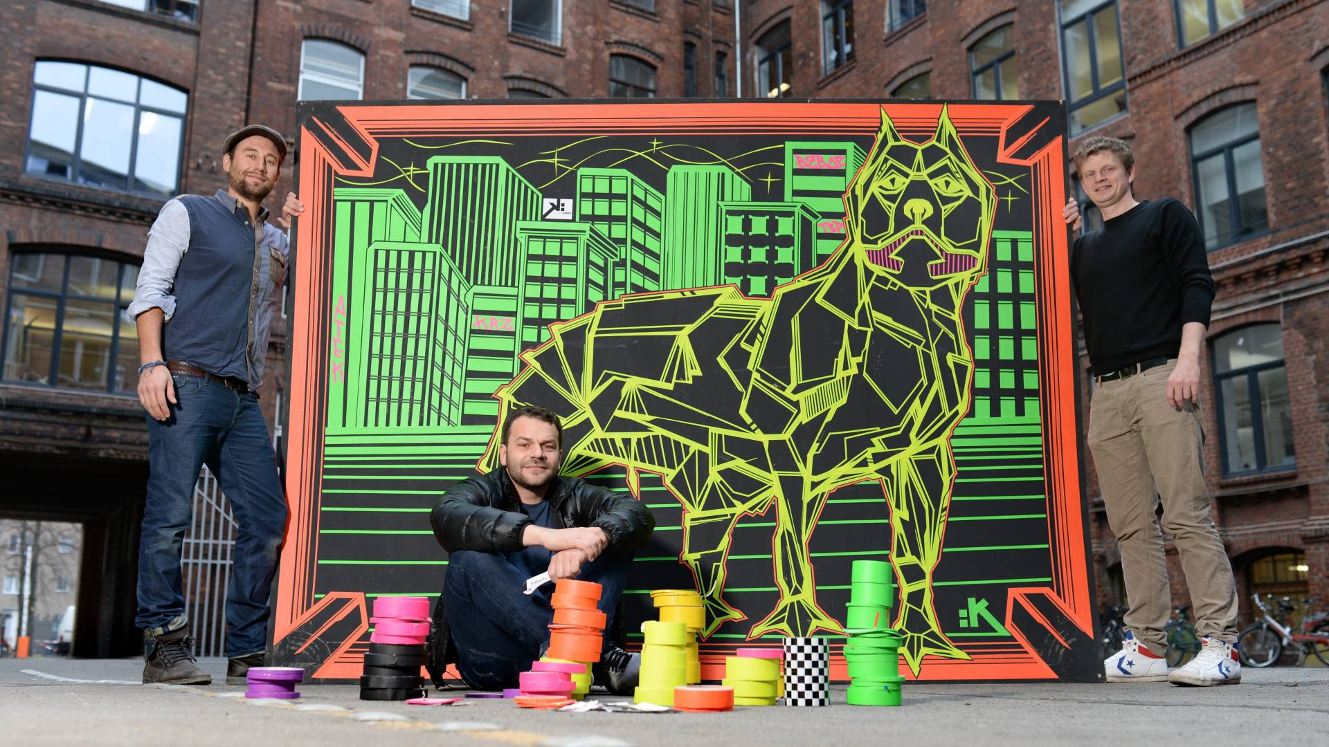 Klebeband is the tape art collective made up of members Bruno “BeezeBoe” Kolberg, Bodo Hobing and Nikolaj “NkoBu” Bultmann. Bruno is an autodidactic graphic designer who has been working since 2003 and Bodo graduated with a degree in communications design. Both artists come from Berlin’s Kreuzberg district. Kolja originates from an artist family and opened a gallery for outsider art with his mother after studying business administration. They all started out doing tape art in clubs or as decoration for parties. Today they create tape art installations as well as 3D work and whole room and building concepts by using and combining organic and geometric forms to discover the dimensions that come out of working with tape. Another part of their work is tape mapping, a combination of tape art and video mapping invented by Klebebande. By projecting video sequences, the tape art artwork appears to be an LED wall with effects that look 3D or like an optical illusion.