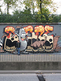 Birne is a graffiti artist who lives in Wuppertal, Germany. He is known for his diverse graphical and dancing-letter styles. Besides classical style writing, his creations also involve media film, installation, graphics and sketches. In the last ten years he has called attention to himself with his art pieces as well as large-sized conceptual murals.
